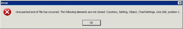 This is due to a file which hosts all the chart settings (an XML-based key value pair collection) becomes corrupt, and is actually cut off.